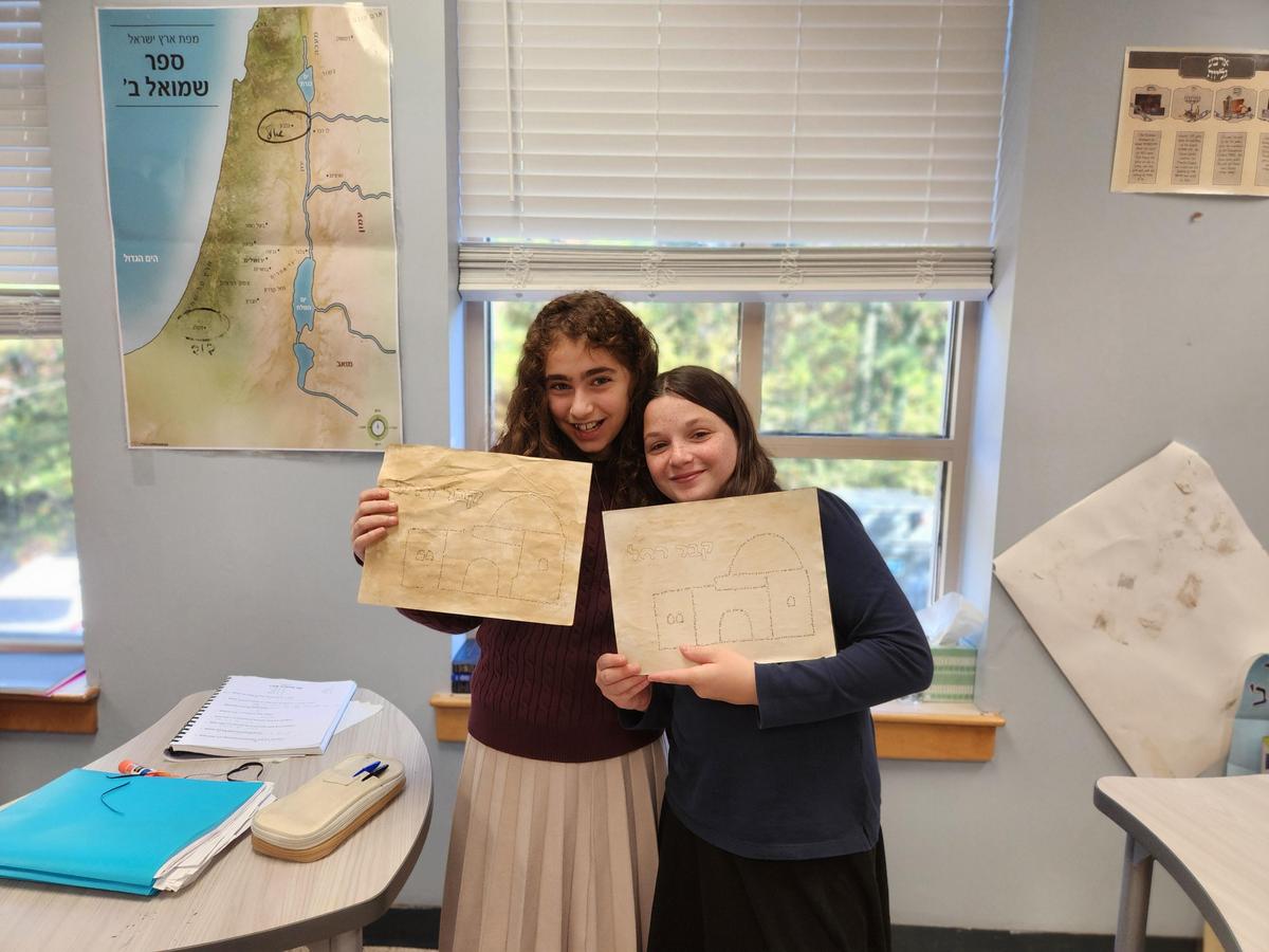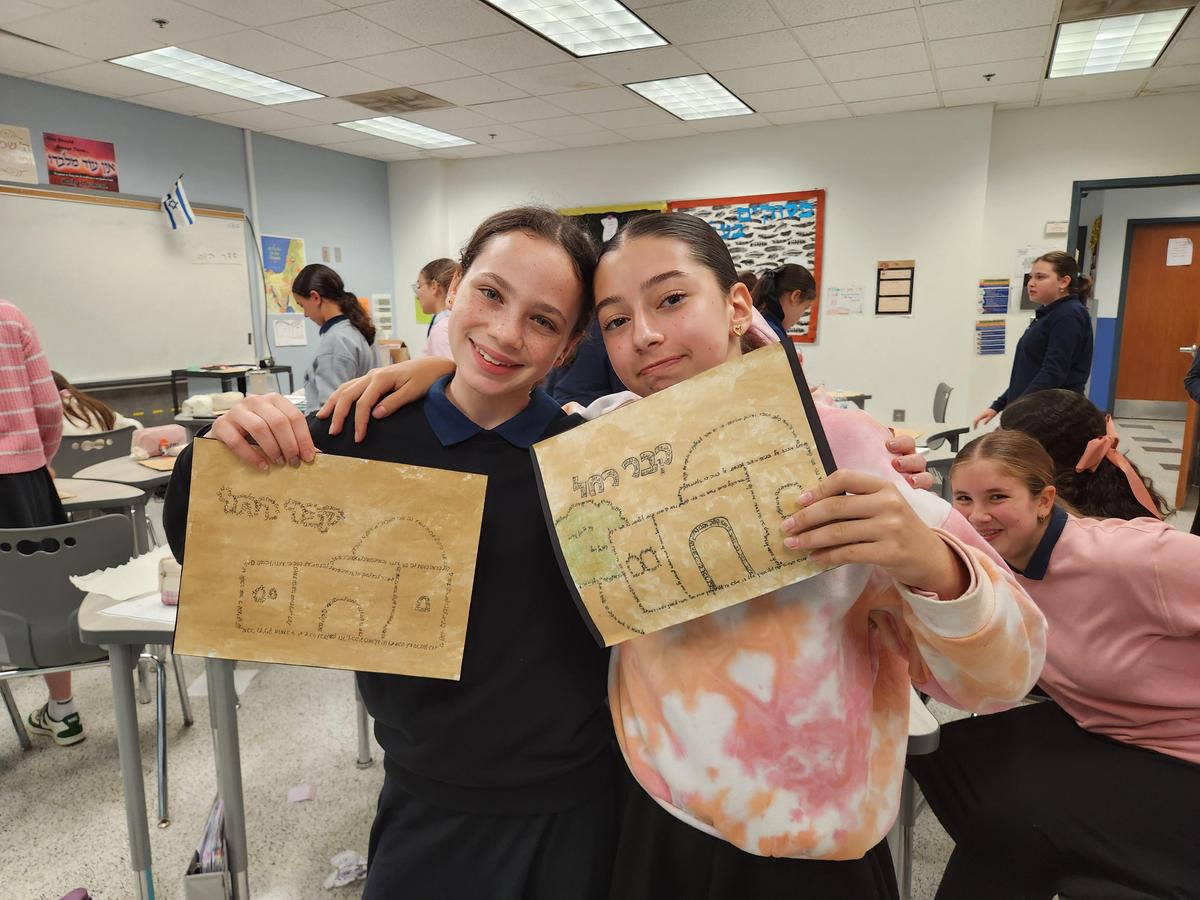 There are a multitude of lessons that we can be taught by our forefathers and mothers. The Jewish nation has a particularly strong connection with Rachel Imeinu, the Matriarch Rachel. The legacy of her sacrifice for her sister and the way she advocated for the Jewish people on their way down to exile is highlighted every year on the anniversary of her passing, her Yartzeit. Mrs. Horowitz's seventh grade class reviewed the highlights of Rachel Imeinu's life and values. Using coffee they stained cardstock and traced out the image of her burial place, covering it with the words of "Kol Berama" to solidify their connection to all that she represents. Their pictures will be displayed in the middle-school hallway for all the students to admire and appreciate.